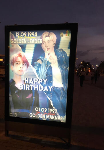 Mupping para el cumpleaños de nuestro líder Kim Namjoon y nuestro Maknae Jeon Jungkook, el cual fue ubicado diagonal al reloj público en el centro histórico de la ciudad, esta zona es transitada por muchos turistas y personas de la ciudad.