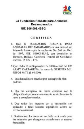 • Donación a la Fundación Rescate Animales Desamparados (FRAD)